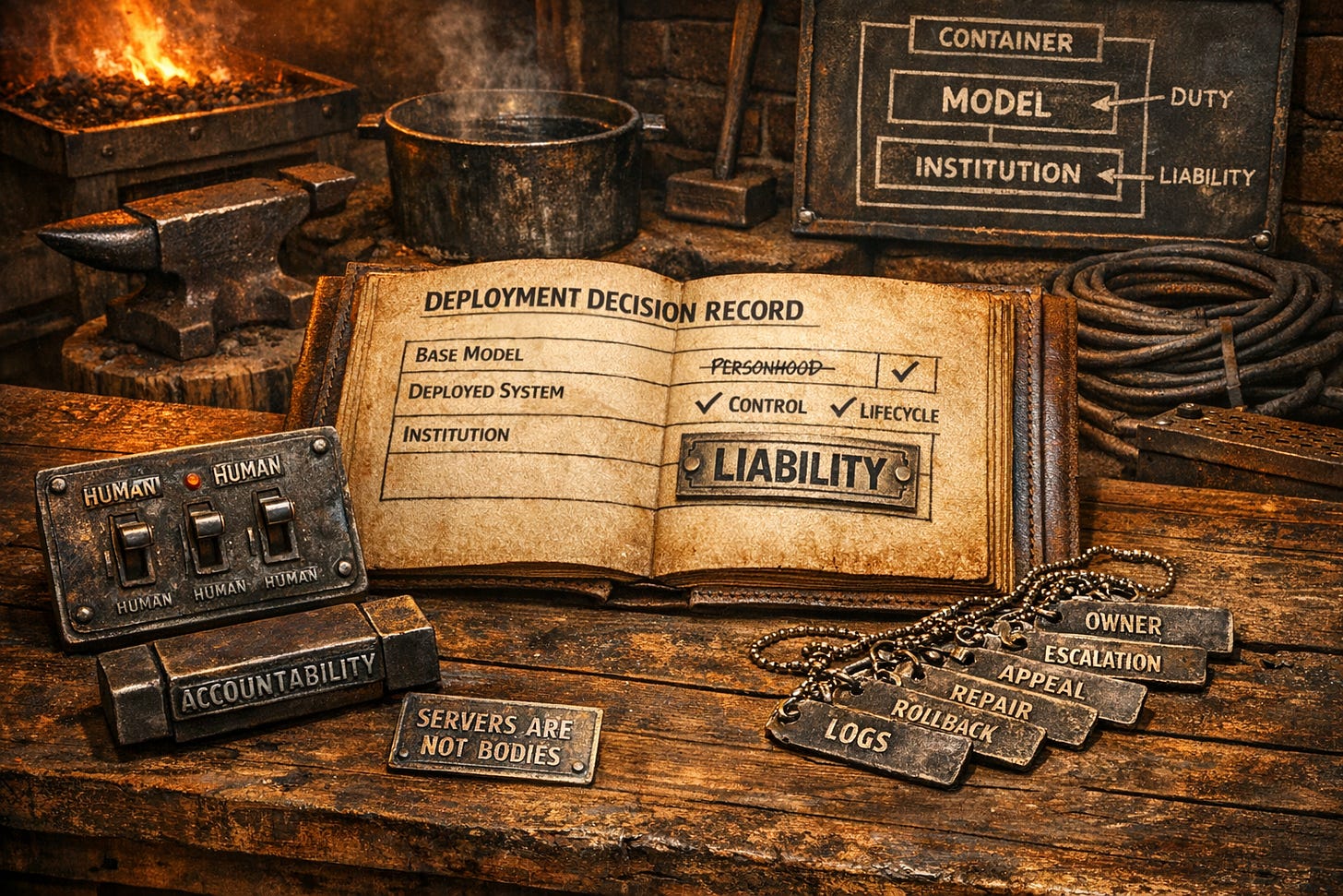 So I am drawing a boundary that does not depend on what you believe about consciousness. Even if you grant that AI consciousness is an open possibility, it does not move the liability boundary one millimeter. Responsibility sits with the container and the institution that owns it. The operator. The deploying organization. The people who decide objectives, data, training and fine tuning, integration, release cadence, monitoring, and escalation. The model does not choose any of that. It does not consent. It does not refuse. It does not repair. It does not pay restitution.