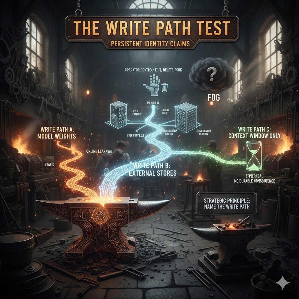 Any claim of persistent identity, continuous experience, or durable consequence must specify the write path. Claims that appeal to “ongoing processes” or “maintained states” without naming where and how those states persist across sessions are architecturally incoherent. If they cannot name the write path, they are selling fog.